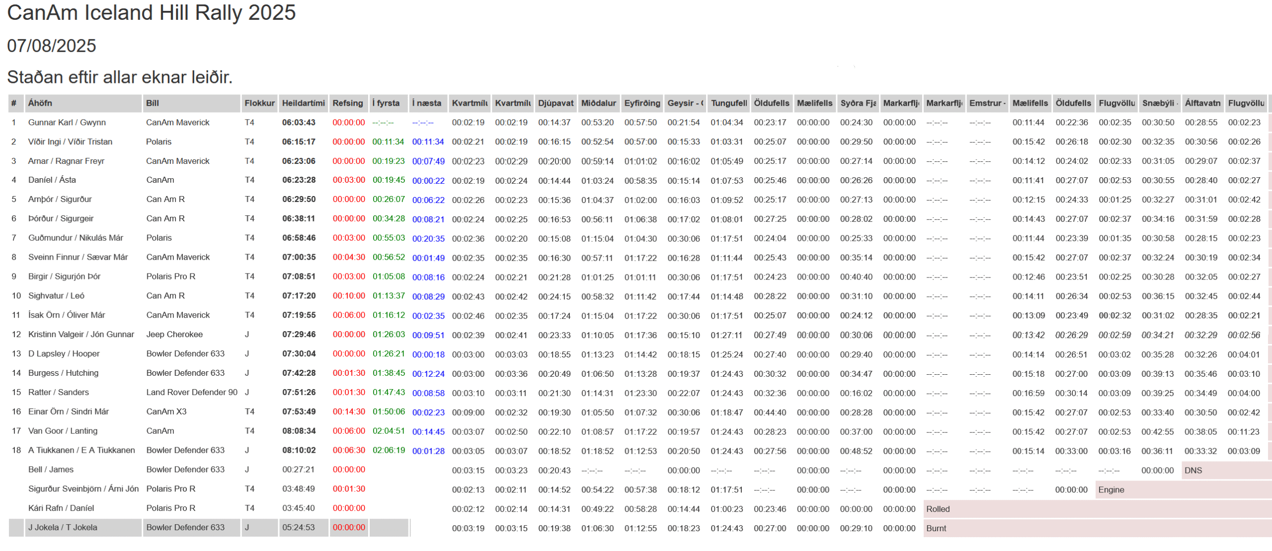 The timekeeper has reported a problem with two of the geofences used by the timing system. One for SS-9 (Mælifellssandur vestur) which did not fully report all the cars going through it. The other for SS-13 (Emstrur – Syðra Fjallabak) where the geofence did not report the passage of any competition vehicle.